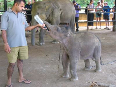Baby elephant gets his bottle at Pinnawela Elephant Orphanage